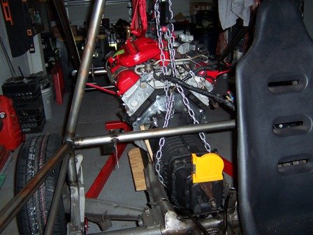 I started getting the engine into place by using an engine hoist as well as several small ratchet ties to get the engine and trans centered into the chassis. Took a lot of time measuring from the trans axle flanges to the torsion flanges to get it equal as well as front to back. Can't spend enough time here as it is important to prevent future problems. Once its in place the motor mounts were fabricated and now all the ancillary pieces can be made and fitted into place. Exhaust, computer mounting,wiring, shifter tube, radiator tubes and hoses etc. I left the hoist and ties in place until all the engine mounts and bracing were in place and welded to prevent movement.