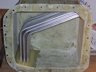 Following Bill James work on his oil pan I decide to try the same thing on mine. Oil cooling on a rotary engine is critical and I feel this will really help. A blast tube will be installed to force the air through the tubes and out the back to the prop and I plan on having an adjustable flap to be able to choke the air at altitude as needed. This pan can hold up to three gallons of oil not counting the oil in the front cooler and lines. The front cooler will have an air dump built into the floor / front landing gear door so I can use it as well if needed to help with hot days etc. I have to get the pan into the oven for post cure and then get the lip surfaced machined flat. I prepped the tubes by sanding them for the mechanical bond and then set up the pan so I could pour wet flox into the corners one at a time to seal the tubes inside as well as to the pan walls. The walls were four layers of bid oriented with the lip of four as well as a thick layer of flox which will be machined. I made several glass fins for the sides and attached them to the bottom of the pan rail for support, cooling and rigidity and then made aluminum fins to go on the bottom of the pan itself. This is a full blown experiment!