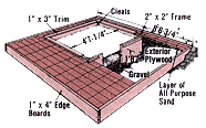 Next, use 5/8" exterior-grade plywood and 2" x 2" wood and cleats to construct the sand box frame according to the dimensions shown in the illustration. Border the frame with 1" x 3" trim treated lumber.